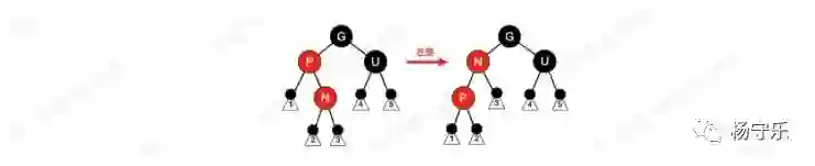 N 的父节点为红色,叔叔节点为黑色。节点 N 是 P 的右孩子,且节点 P 是 G 的左孩子。此时先对节点 P 进行左旋,调整 N 与 P 的位置。接下来按照情况五进行处理,以恢复性质4。