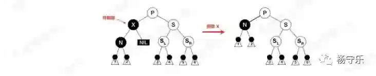 N 是新的根。在这种情形下,我们就做完了。我们从所有路径去除了一个黑色节点,而新根是黑色的,所以性质都保持着。