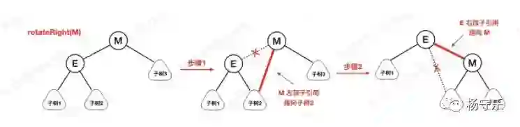 2、将节点 E 的右孩子引用指向节点 M,完成旋转