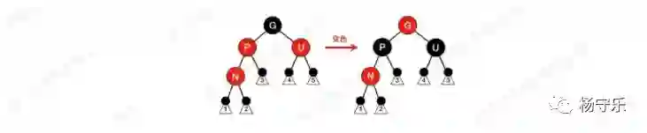 N 的父节点是红色(节点 P 为红色,其父节点必然为黑色),叔叔节点 U 也是红色。由于 P 和 N 均为红色,所有性质4被打破,此时需要进行调整。这种情况下,先将 P 和 U 的颜色染成黑色,再将 G 的颜色染成红色。此时经过 G 的路径上的黑色节点数量不变,性质5仍然满足。但需要注意的是 G 被染成红色后,可能会和它的父节点形成连续的红色节点,此时需要递归向上调整。