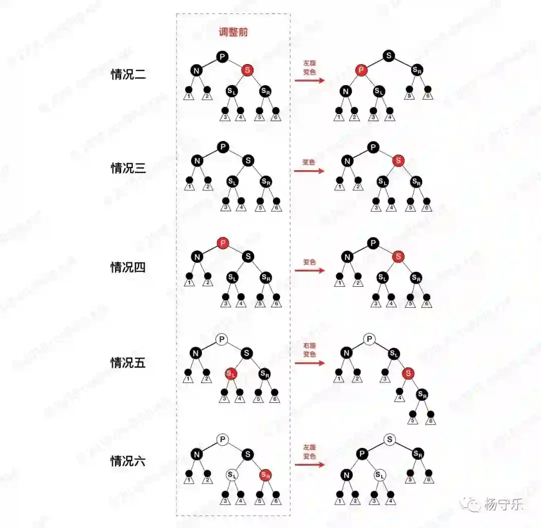 红黑树删除的情况比较多,大家刚开始看的时候可能会比较晕。可能会产生这样的疑问,为啥红黑树会有这种删除情况,为啥又会有另一种情况,它们之间有什么联系和区别?和大家一样,我刚开始看的时候也有这样的困惑,直到我把所有情况对应的图形画在一起时,拨云见日,一切都明了了。此时天空中出现了4个字,原来如此、原来如此、原来如此。所以,请看图吧:
