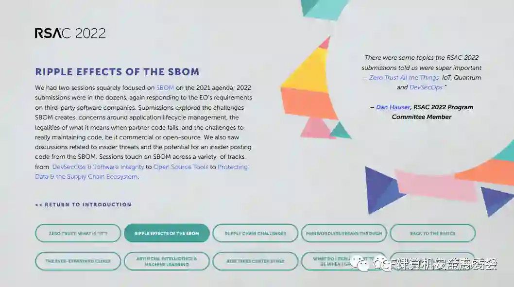 软件物料清单 (SBOM) 是代码库的完整清单,包括开源组件,这些开源组件的许可证和版本信息,以及这些组件中是否存在任何已知漏洞。RSAC2022大会则提交了数十份材料,主要围绕讨论如何约束对第三方软件公司的要求。其中值得注意的是,围绕供应链应用程序的生命周期管理,当合作伙伴的代码挂起引发的连锁反应,以及维护代码所面临的挑战等,议题还触及了从DevSecOps和软件完整性到开源工具,再到保护数据与供应链生态系统等方面。
