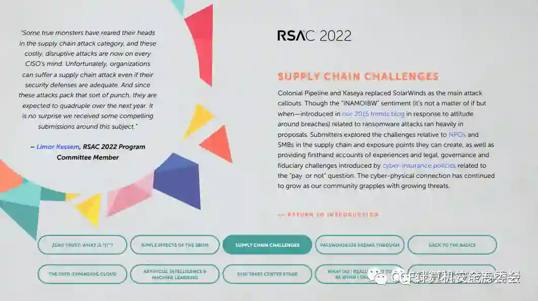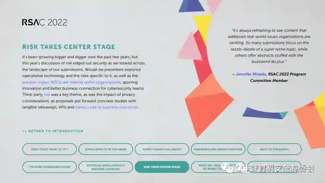 在过去几年中,风险的规模越来越大,但今年关于风险的讨论在提交的内容中不再局限于安全本身。更多的是将探讨运营技术和特定风险,以及BISO在组织内部产生的积极影响,促进网络安全团队的创新和更好的业务联系。第三方风险是一个关键主题,隐私保护的影响也是一个关键主题,以及具体的研究包括KPI和业务成果相关的业务指标等。