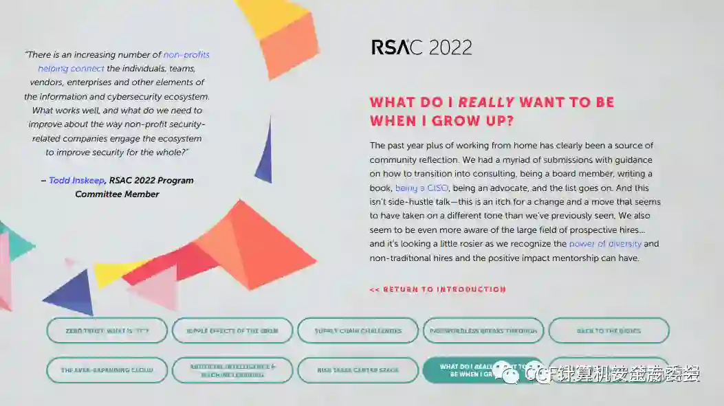 2022年的RSA大会已经正式开幕,本次大会议程为期4天。每年RSA大会中的主题演讲和参展机构所涉安全领域的安全热词都会成为大家热议的焦点。在对早期提交的数千份报告进行研判和筛选后,RSA发布其预测的2022年网络安全行业十大安全趋势,并为我们带来超过500个议题。