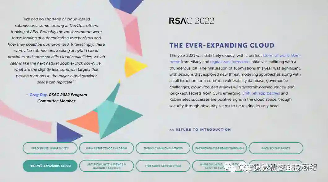 云服务时代的到来使得云安全有关的建议和方案激增,安全即服务、云安全威胁、云部署与防护、云应用程序安全等得到了研究和实践,特别是全球疫情环境下的远程管理与交付、远程办公和业务云迁移,这为云安全带来了巨大的机会和挑战。2022RSA会议上将探讨新的威胁建模方法,呼吁建立通用漏洞数据库、治理挑战、具有灾难性后果的以云为中心的攻击手段,以及云安全防护的长期手段是什么等议题。