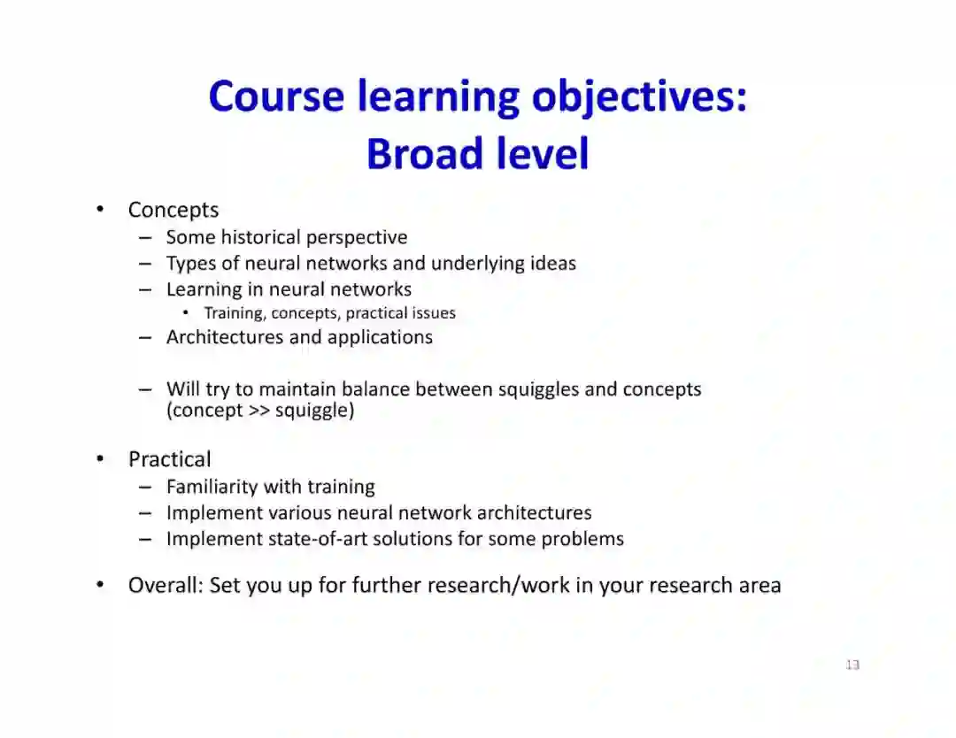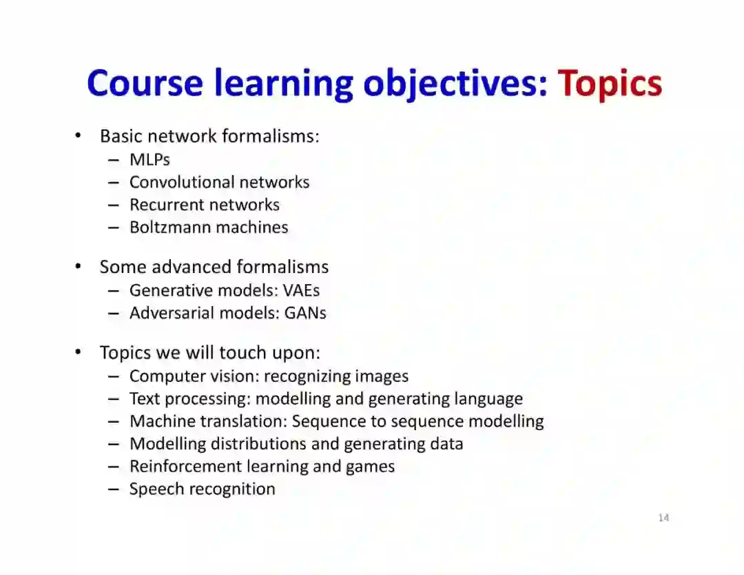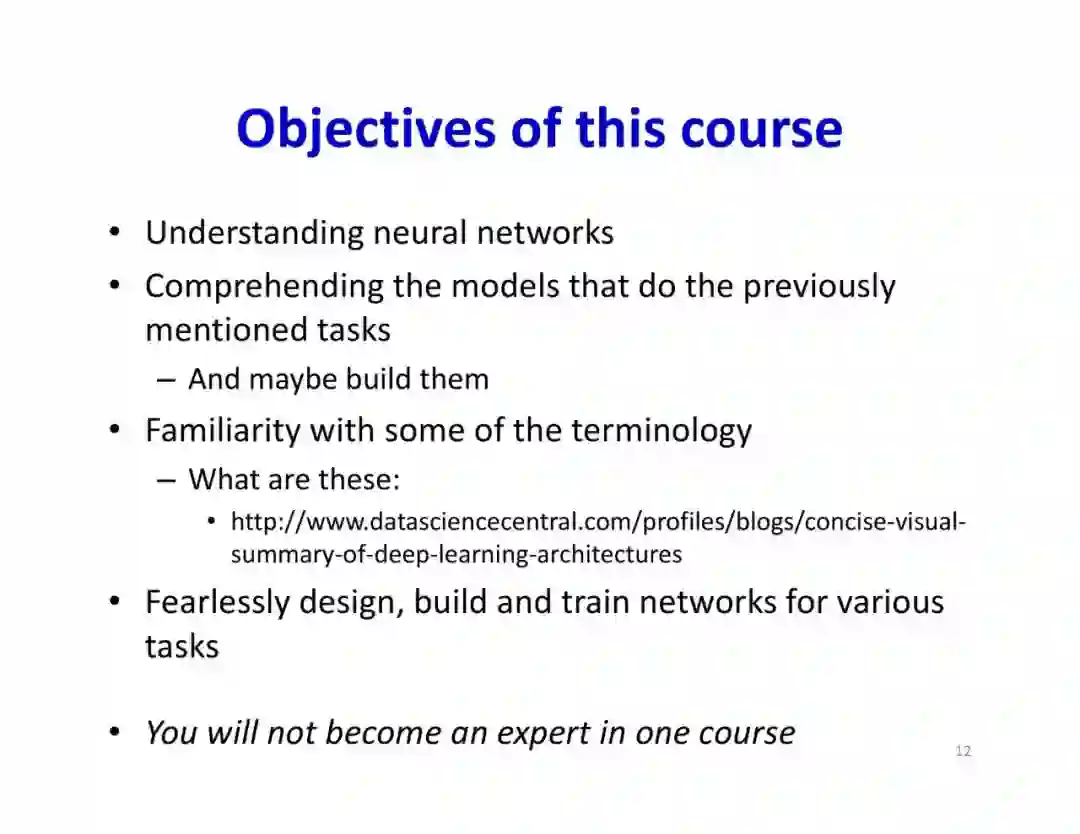 在这个课程中,我们将学习深度神经网络的基础知识,以及它们在各种AI任务中的应用。在课程结束后,学生将对课程主题有足够的了解,并能够将深度学习应用于各种任务。学生还将阅读当前关于该领域的大量文献,并通过进一步的研究扩展自己的专业知识。