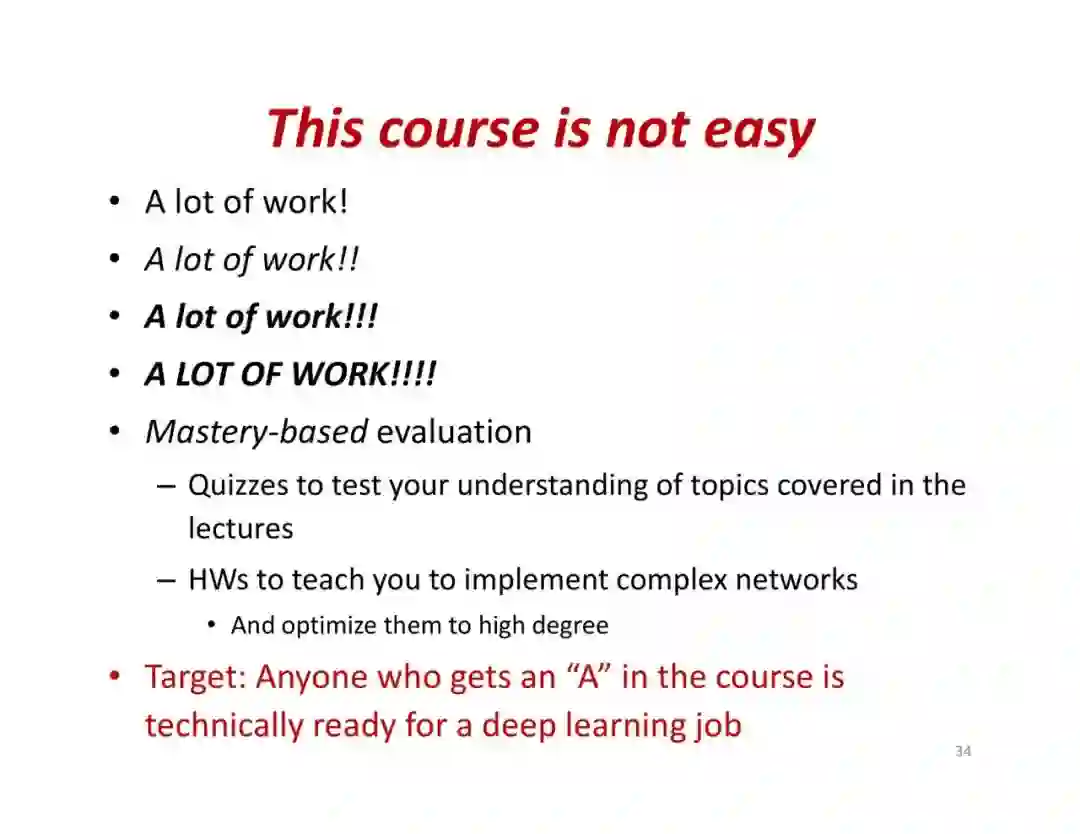 作为学生,你将学习构建深度学习模型所需的各种工具。作业通常有两个部分,即Autolab和Kaggle。Kaggle部分允许我们探索多种架构,并了解如何调优并持续改进模型。所有作业的任务都是相似的,学习如何使用多种深度学习方法解决相同的任务是很有趣的。总的来说,在本课程结束时,你将有足够的信心构建和调优深度学习模型。