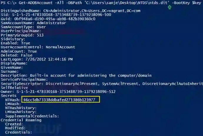 DSInternals PowerShell模块提供了构建在框架之上的易于使用的cmdlet。主要功能包括离线ntds.dit文件操作以及通过目录复制服务(DRS)远程协议查询域控制器。