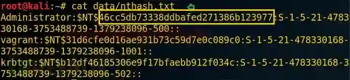 可以看到,它已从ntd.dit文件中转储了NTLM密码。