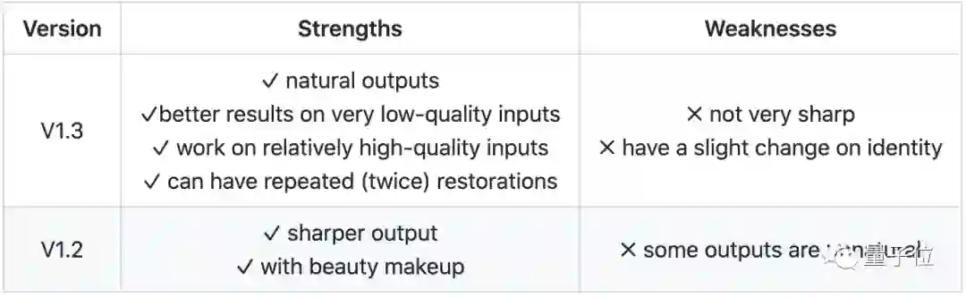 其中,V1.3是最近更新的一版,修复效果更加自然。同时还能在低质量输入的情况下,输出高质量结果。