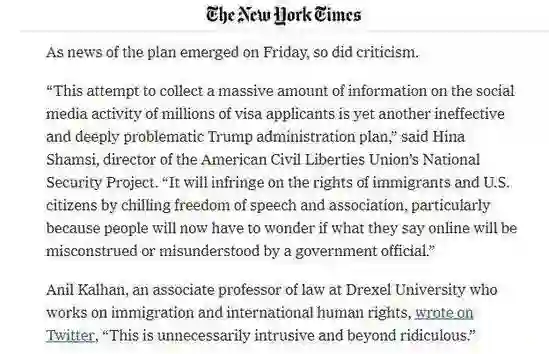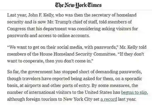2017年3月的时候,美国《纽约时报》报道特朗普政府为加大对进入美国的外国人的审查力度,在2017年9月就宣布想收集申请人的社交网站信息进行审查。