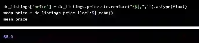 在我们取平均价格之前,你将注意到价格列有 object 类型,因为价格有美元符号和逗号(上面的示例没有显示逗号,因为所有的值都小于$1000)。