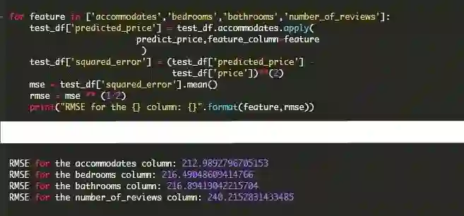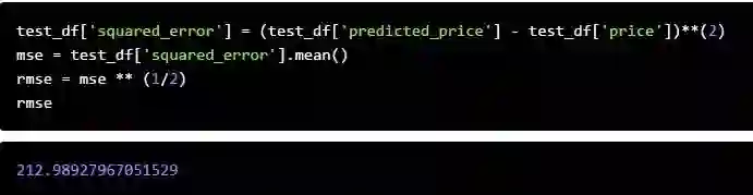 我们的RMSE大约是213美元。关于RMSE的一个方便的事情是,由于我们进行了平方然后取平方根,因此,RMSE的单位和我们预测的值是一样的,这使得我们很容易理解误差的标度。
