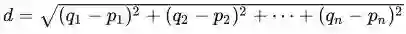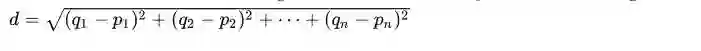 Here’s the general formula for Euclidean distance: d=(q1−p1)2+(q2−p2)2+⋯+(qn−pn)2 where q1 to qn represent the feature values for one observation and p1 to pn represent the feature values for the other observation.