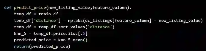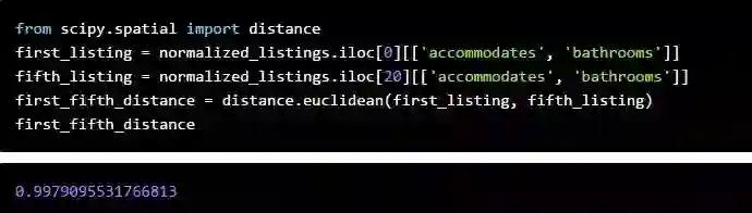 让我们通过定义我们将要使用的相似性度量来开始构建我们的真实模型。然后,我们将实现k最近邻算法,并使用它来给出一个新房源的价格。出于本教程的目的,我们将使用一个固定的k值5,但是一旦你熟悉了这个算法的工作流,你就可以对这个值进行试验,看看用更低或更高的k值是否可以得到更好的结果。
