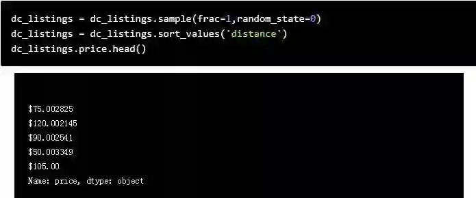 如果我们只使用距离为0的前5个值,我们的预测将偏向于数据集的现有顺序。相反,我们将随机化观测值的顺序,然后选择距离为0的前5行。我们将使用 DataFrame .sample() 来随机化行。这个方法通常用于选择DataFrame的一个随机部分,但是我们将告诉它随机选择100%,这会为我们随机打乱行。