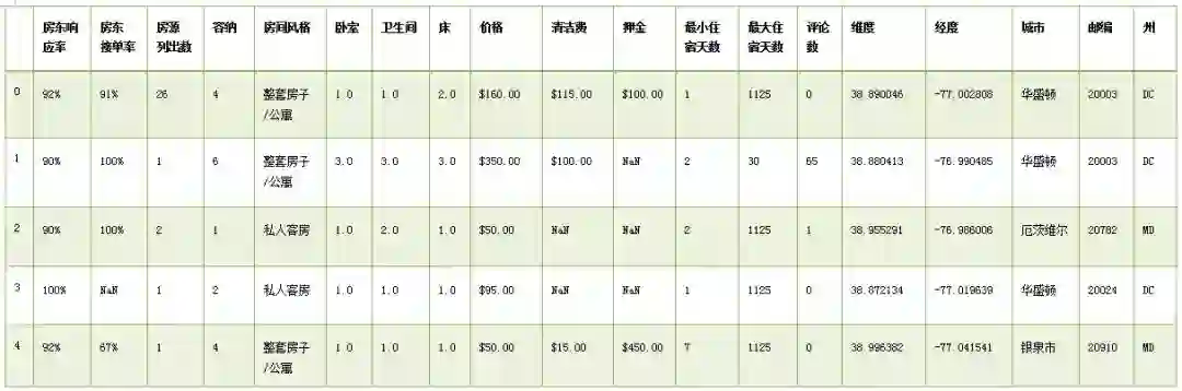 数据集中的每一行都是一个特定的房源页面,代表华盛顿特区Airbnb上可租用的房源。用机器学习的术语来说,每一行都是一个观察。这些列描述了每个房源页面的不同特性(用机器学习术语来说,是特征)。