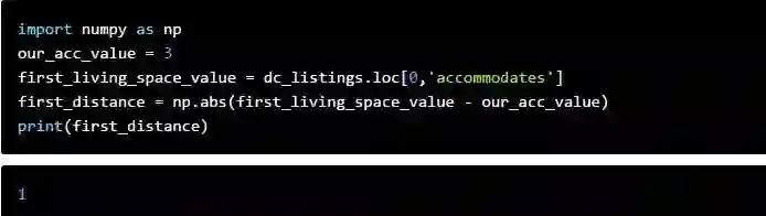 我们首先只使用accommodates特征来计算数据集中第一个居住空间与我们自己的居住空间之间的距离。我们可以使用NumPy函数np.abs() 来获得绝对值。