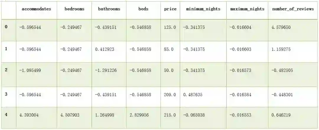 让我们看一下这个清理过的版本,它被称为 dc_airbnb. normalized.csv,并预览前几行:
