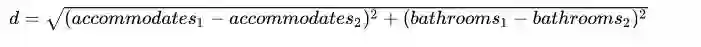 为了找到两个居住空间之间的距离,我们需要计算两个accommodates值之间的差值平方,两个bathrooms值之间的差值平方,将它们相加,然后对结果的和取平方根。