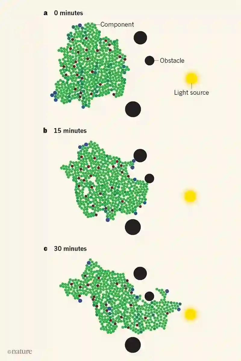 据悉,在单个机器人的设计上,研究人员选择简单的“盘状”造型,它们由“粒子”构成,且不能做平面移动,只可像相机光圈一般做伸缩运动。但当它们聚集一起后,研究人员只要给它们光线刺激,整个系统就会对这一信号做出响应,并按照偏移模式振荡,集体朝着刺激源移动。