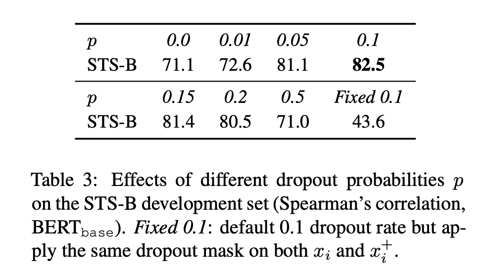 文章中设置不同的 dropout 率做了八组实验,其中 fixed 0.1 是使用同样的 dropout mask 做两次(也就是自己与正样本得到一样的 embedding),这里发现 dropout=0、dropout=fix 0.1 差别很大,按道理来说,自身与自身产生的正样本