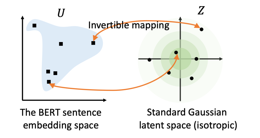 其中 u 就是 BERT 空间向量(observe space),z 即是高斯空间向量(latent space),