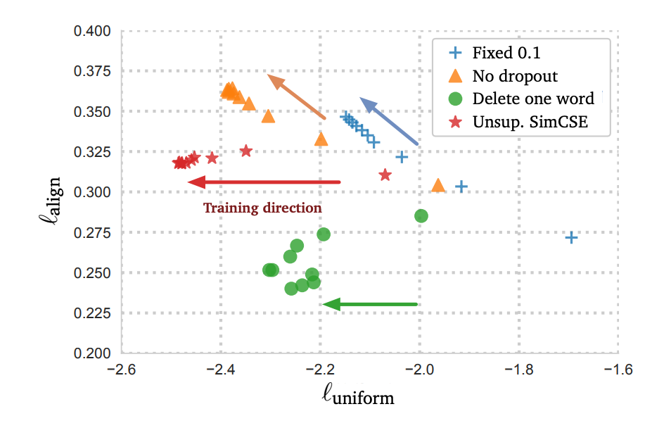 文中对于上述情况,做了一个结果反推现象上的分析,画出了训练过程迭代中 Alignment、uniformity 指标分析图,发现随着迭代进行 4 个方法都可以减少 uniform,也就是分布都会走向均匀分布。但 fixed0.1 和 no dropout 优化不动 alignment,反而增大了。