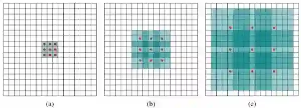 经常用于分割任务以增大有效感受野的一个技巧。标准卷积操作中每个输出神经元对应的输入局部区域是连续的,而扩张卷积对应的输入局部区域在空间位置上不连续。扩张卷积保持卷积参数量不变,但有更大的有效感受野。