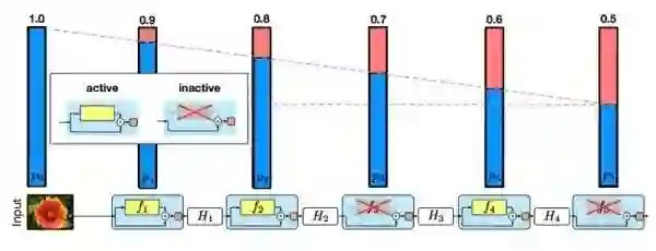 随机深度 ResNet的改进。旨在缓解梯度消失和加速训练。类似于随机失活(dropout),其以一定概率随机将residual模块失活。失活的模块直接由短路分支输出,而不经过有参数的分支。在测试时,前馈经过全部模块。随机深度说明residual模块是有信息冗余的。