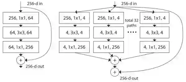 ResNeXt ResNet的另一改进。传统的方法通常是靠加深或加宽网络来提升性能,但计算开销也会随之增加。ResNeXt旨在不改变模型复杂度的情况下提升性能。受精简而高效的Inception模块启发,ResNeXt将ResNet中非短路那一分支变为多个分支。和Inception不同的是,每个分支的结构都相同。ResNeXt的关键点是:(1). 沿用ResNet的短路连接,并且重复堆叠相同的模块组合。(2). 多分支分别处理。(3). 使用1×1卷积降低计算量。其综合了ResNet和Inception的优点。此外,ResNeXt巧妙地利用分组卷积进行实现。ResNeXt发现,增加分支数是比加深或加宽更有效地提升网络性能的方式。ResNeXt的命名旨在说明这是下一代(next)的ResNet。
