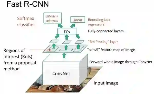 R-CNN的弊端是需要多次前馈网络,这使得R-CNN的运行效率不高,预测一张图像需要47秒。Fast R-CNN同样基于候选区域进行目标检测,但受SPPNet启发,在Fast R-CNN中,不同候选区域的卷积特征提取部分是共享的。也就是说,我们先将整副图像前馈网络,并提取conv5卷积特征。之后,基于候选区域生成算法的结果在卷积特征上进行采样,这一步称为兴趣区域汇合。最后,对每个候选区域,进行目标定位,即两分支(分类+回归)输出。