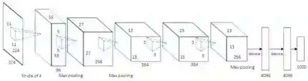 AlexNet 60M参数,ILSVRC 2012的冠军网络。网络基本架构为:conv1 (96) -> pool1 -> conv2 (256) -> pool2 -> conv3 (384) -> conv4 (384) -> conv5 (256) -> pool5 -> fc6 (4096) -> fc7 (4096) -> fc8 (1000) -> softmax。AlexNet有着和LeNet-5相似网络结构,但更深、有更多参数。conv1使用11×11的滤波器、步长为4使空间大小迅速减小(227×227 -> 55×55)。AlexNet的关键点是:(1). 使用了ReLU激活函数,使之有更好的梯度特性、训练更快。(2). 使用了随机失活(dropout)。(3). 大量使用数据扩充技术。AlexNet的意义在于它以高出第二名10%的性能取得了当年ILSVRC竞赛的冠军,这使人们意识到卷机神经网络的优势。此外,AlexNet也使人们意识到可以利用GPU加速卷积神经网络训练。AlexNet取名源自其作者名Alex。