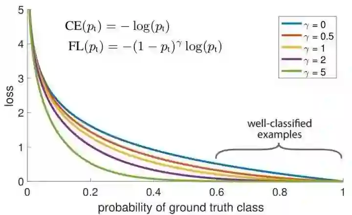 RetinaNet认为,基于直接回归的方法性能通常不如基于候选区域方法的原因是,前者会面临极端的类别不平衡现象。基于候选区域的方法可以通过候选区域过滤掉大部分的背景区域,但基于直接回归的方法需要直接面对类别不平衡。因此,RetinaNet通过改进经典的交叉熵损失以降低对已经分的很好的样例的损失值,提出了焦点(focal)损失函数,以使模型训练时更加关注到困难的样例上。RetinaNet取得了接近基于直接回归方法的速度,和超过基于候选区域的方法的性能。
