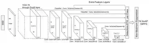 相比YOLO,SSD在卷积特征后加了若干卷积层以减小特征空间大小,并通过综合多层卷积层的检测结果以检测不同大小的目标。此外,类似于Faster R-CNN的RPN,SSD使用3×3卷积取代了YOLO中的全连接层,以对不同大小和长宽比的锚盒来进行分类/回归。SSD取得了比YOLO更快,接近Faster R-CNN的检测性能。后来有研究发现,相比其他方法,SSD受基础模型性能的影响相对较小。