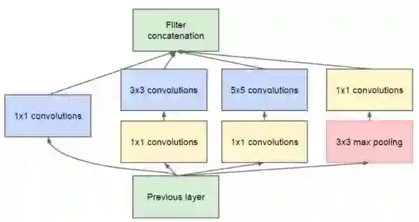 GoogLeNet 5M参数,ILSVRC 2014的冠军网络。GoogLeNet试图回答在设计网络时究竟应该选多大尺寸的卷积、或者应该选汇合层。其提出了Inception模块,同时用1×1、3×3、5×5卷积和3×3汇合,并保留所有结果。网络基本架构为:conv1 (64) -> pool1 -> conv2^2 (64, 192) -> pool2 -> inc3 (256, 480) -> pool3 -> inc4^5 (512, 512, 512, 528, 832) -> pool4 -> inc5^2 (832, 1024) -> pool5 -> fc (1000)。GoogLeNet的关键点是:(1). 多分支分别处理,并级联结果。(2). 为了降低计算量,用了1×1卷积降维。GoogLeNet使用了全局平均汇合替代全连接层,使网络参数大幅减少。GoogLeNet取名源自作者所处单位(Google),其中L大写是为了向LeNet致敬,而Inception的名字来源于盗梦空间中的"we need to go deeper"梗。