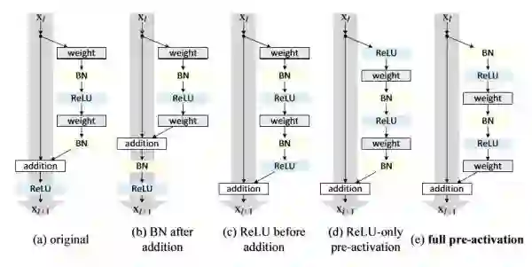 preResNet ResNet的改进。preResNet整了residual模块中各层的顺序。相比经典residual模块(a),(b)将BN共享会更加影响信息的短路传播,使网络更难训练、性能也更差;(c)直接将ReLU移到BN后会使该分支的输出始终非负,使网络表示能力下降;(d)将ReLU提前解决了(e)的非负问题,但ReLU无法享受BN的效果;(e)将ReLU和BN都提前解决了(d)的问题。preResNet的短路连接(e)能更加直接的传递信息,进而取得了比ResNet更好的性能。