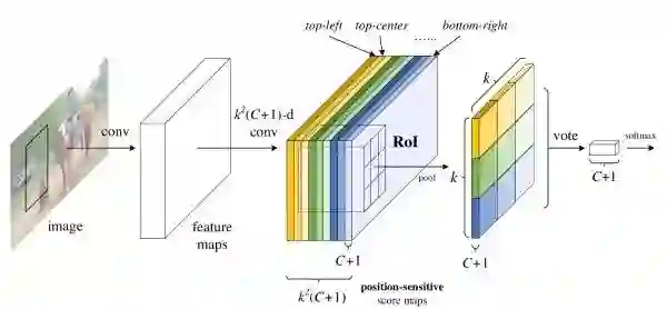 Faster R-CNN在RoI pooling之后,需要对每个候选区域单独进行两分支预测。R-FCN旨在使几乎所有的计算共享,以进一步加快速度。由于图像分类任务不关心目标具体在图像的位置,网络具有平移不变性。但目标检测中由于要回归出目标的位置,所以网络输出应当受目标平移的影响。为了缓和这两者的矛盾,R-FCN显式地给予深度卷积特征各通道以位置关系。在RoI汇合时,先将候选区域划分成3×3的网格,之后将不同网格对应于候选卷积特征的不同通道,最后每个网格分别进行平均汇合。R-FCN同样采用了两分支(分类+回归)输出。