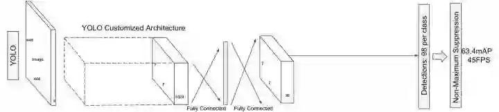 将图像划分成7×7的网格,其中图像中的真实目标被其划分到目标中心所在的网格及其最接近的锚盒。对每个网格区域,网络需要预测:每个锚盒包含目标的概率(不包含目标时应为0,否则为锚盒和真实包围盒的IoU)、每个锚盒的4个坐标、该网格的类别概率分布。每个锚盒的类别概率分布等于每个锚盒包含目标的概率乘以该网格的类别概率分布。相比基于候选区域的方法,YOLO需要预测包含目标的概率的原因是,图像中大部分的区域不包含目标,而训练时只有目标存在时才对坐标和类别概率分布进行更新。