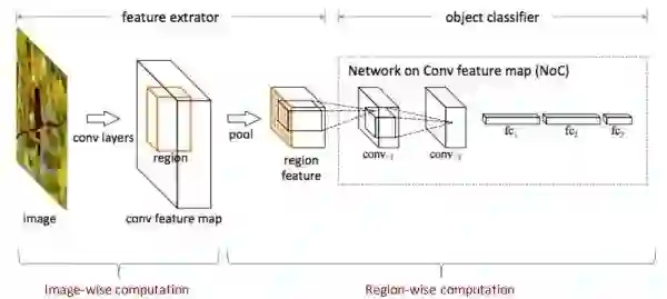 基于候选区域的目标检测算法通常需要两步:第一步是从图像中提取深度特征,第二步是对每个候选区域进行定位(包括分类和回归)。其中,第一步是图像级别计算,一张图像只需要前馈该部分网络一次,而第二步是区域级别计算,每个候选区域都分别需要前馈该部分网络一次。因此,第二步占用了整体主要的计算开销。R-CNN, Fast R-CNN, Faster R-CNN, R-FCN这些算法的演进思路是逐渐提高网络中图像级别计算的比例,同时降低区域级别计算的比例。R-CNN中几乎所有的计算都是区域级别计算,而R-FCN中几乎所有的计算都是图像级别计算。
