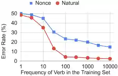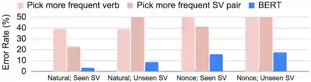 BERT 在自然和随机数评估语句上的错误率,按训练期间是否在同一句子中看到特定的主语谓语 (SV) 对进行分类。BERT 在未见过的主语谓语对上的表现远远优于简单的启发式算法,例如,选择更频繁的谓语动词或选择更频繁的主语谓语对