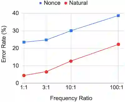 最后,我们想了解动词单复数形式的相对频率如何影响 BERT 的预测结果。例如,如果动词的一种形式(例如,“combat”)比另一种动词形式(例如,“combats”)更频繁地出现在预训练数据中,那么 BERT 更有可能分配高概率到出现频率更高的形式,即使它在语法上是不正确的。为了评估这一点,我们再次使用了相同的 60 个动词,但这次我们创建了预训练数据的人为操纵版本,其中两种动词形式之间的出现频率比从 1:1 变化到 100:1 不等。下图显示了 BERT 在这些不同程度的频率不平衡下的表现情况: