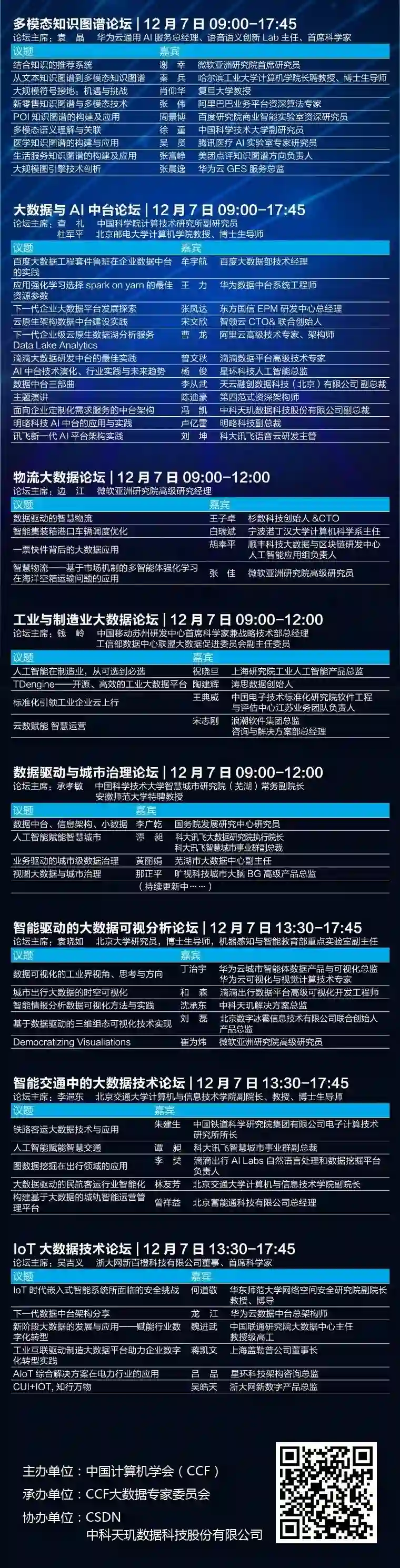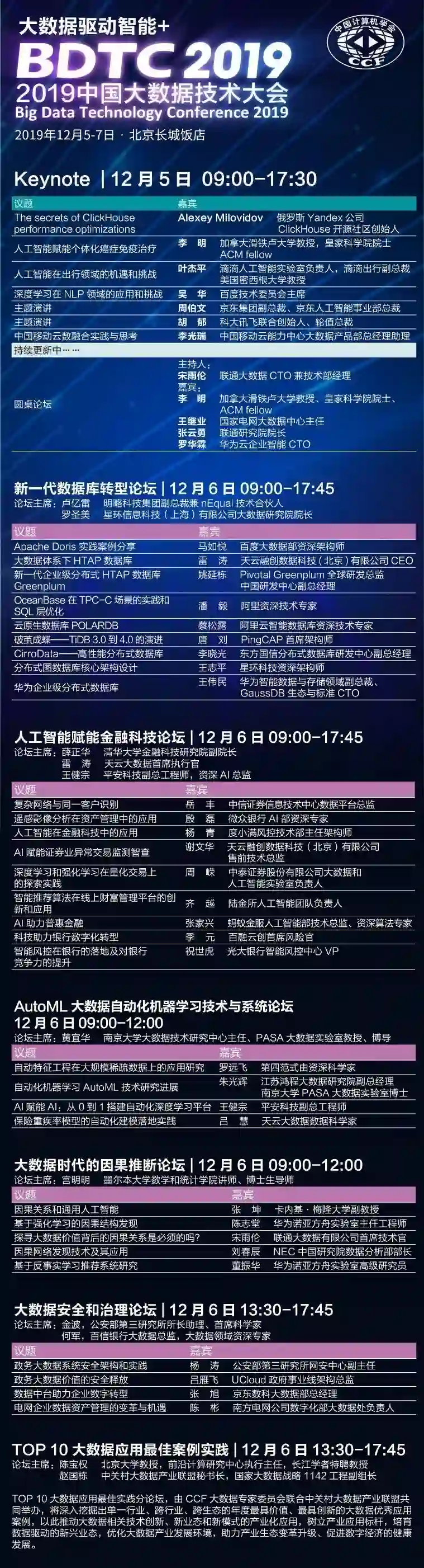 新一代数据库转型、人工智能赋能金融科技、AutoML大数据自动化机器学习技术与系统、大数据时代的因果推断、大数据安全和治理、多模态知识图谱、大数据与AI中台、物流大数据、工业与制造业大数据、数据驱动与城市治理、智能驱动的大数据可视分析、IoT大数据技术、智能交通中的大数据技术