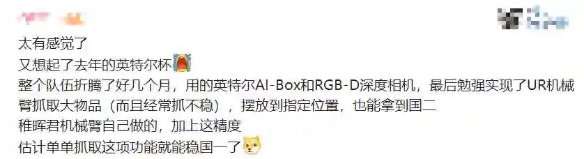有网友评论道:「太有感觉了,又想起了去年的英特尔杯,整个队伍折腾了好几个月,用的英特尔AI-Box和RGB-D深度相机,最后勉强实现了UR机械臂抓取大物品(而且经常抓不稳),摆放到指定位置,也能拿到国二。稚晖君机械臂自己做的,加上这精度,估计单单抓取这项功能就能稳国一了。」