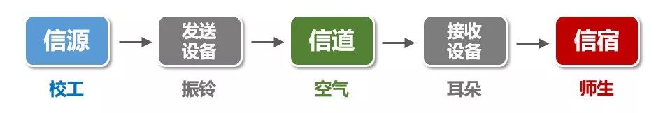 例如下课时,校工打铃:校工就是信源,空气就是信道,而老师和同学们,就是信宿。