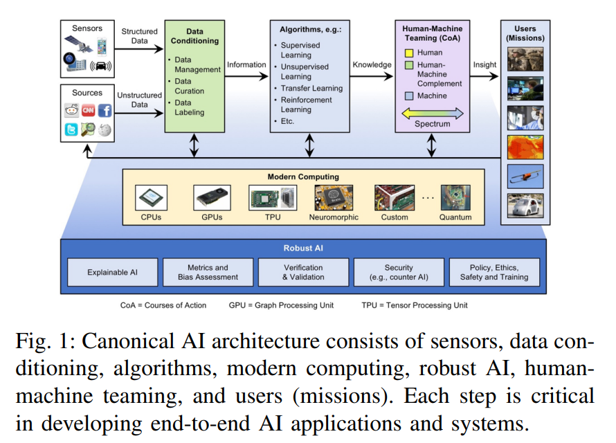 AI生态系统将嵌入式计算(边缘计算)、传统高性能计算(HPC)和高性能数据分析(HPDA)的组件聚集在一起,这些组件必须一起工作,有效地为决策者、作战人员和分析人员提供使用的能力。图1捕捉了这种端到端AI解决方案及其组件的架构概述。在图1的左侧,结构化和非结构化数据源提供了实体和/或现象学的不同视图。这些原始数据产品被送入数据调节步骤,在这个步骤中,它们被融合、聚合、结构化、积累并转换为信息。数据调节步骤生成的信息输入到大量有监督和无监督算法中,如神经网络,这些算法提取模式,预测新事件,填充缺失数据,或在数据集中寻找相似性,从而将输入信息转换为可操作的知识。然后将这些可操作的知识传递给人类,以便在人机协作阶段进行决策过程。人机组合阶段为用户提供了有用的和相关的洞察力,将知识转化为可操作的情报或洞察力。