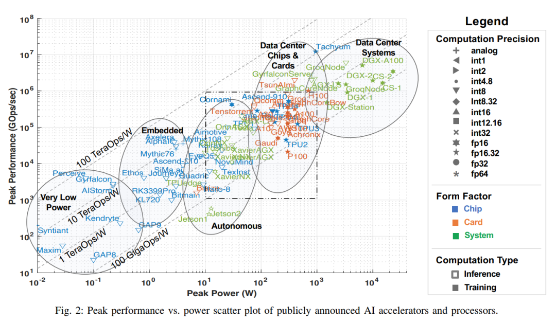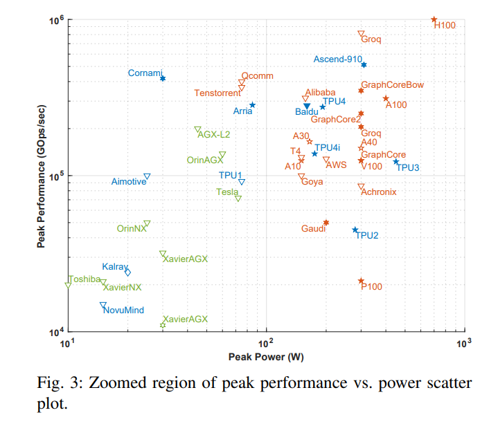 人工智能的许多最新进展至少可以部分归功于计算硬件[6]、[7]、[25]、[26]的进步,使计算量大的机器学习算法成为可能,特别是dnn。这项调研从公开的材料中收集性能和电力信息,包括研究论文、技术贸易出版物、公司基准等。虽然有很多途径可以获取公司和初创公司(包括那些处于静默期的公司)的信息,但这些信息有意被排除在本次调研之外;当这些数据公开时,将包括在本次调研中。这些公共数据的关键指标如图2所示,它绘制了最近的处理器能力(截至2022年7月),映射出峰值性能与功耗的关系。虚线框描述了图3中放大并绘制的非常密集的区域。