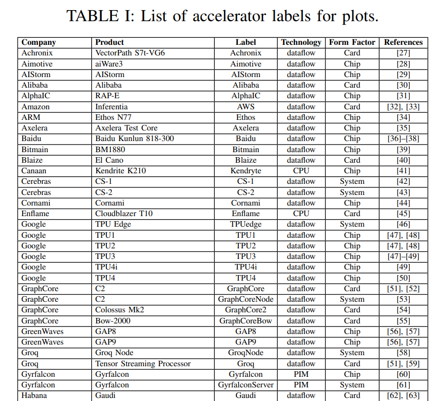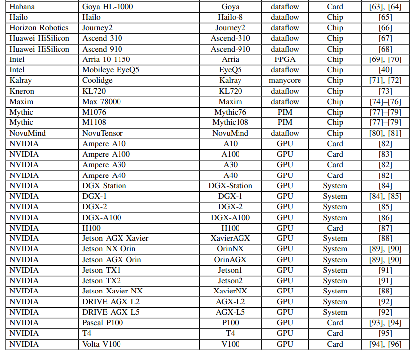 有许多综述[13]-[24]和其他论文,涵盖了AI加速器的各个方面。例如,这项多年调查的第一篇论文包括某些AI模型的FPGA的峰值性能;然而,上述的一些调查深入地涵盖了FPGA,因此它们不再包括在本次综述中。这项多年的综述工作和本文的重点是收集一个全面的人工智能加速器的列表,其计算能力,电力效率,并最终在嵌入式和数据中心应用中使用加速器的计算效率。随着这一重点,本文主要比较神经网络加速器是有用的政府和工业传感器和数据处理应用。在前几年的论文中包含的一些加速器和处理器在今年的调查中被排除在外。它们被丢弃了,因为它们被同一家公司的新加速器超越了,它们不再被提供,或者它们不再与主题相关。