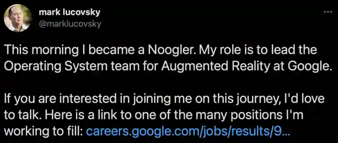 除了表示自己将负责一个AR操作系统团队以外,Lucovsky还顺便安利了一波这次招聘的全新岗位。