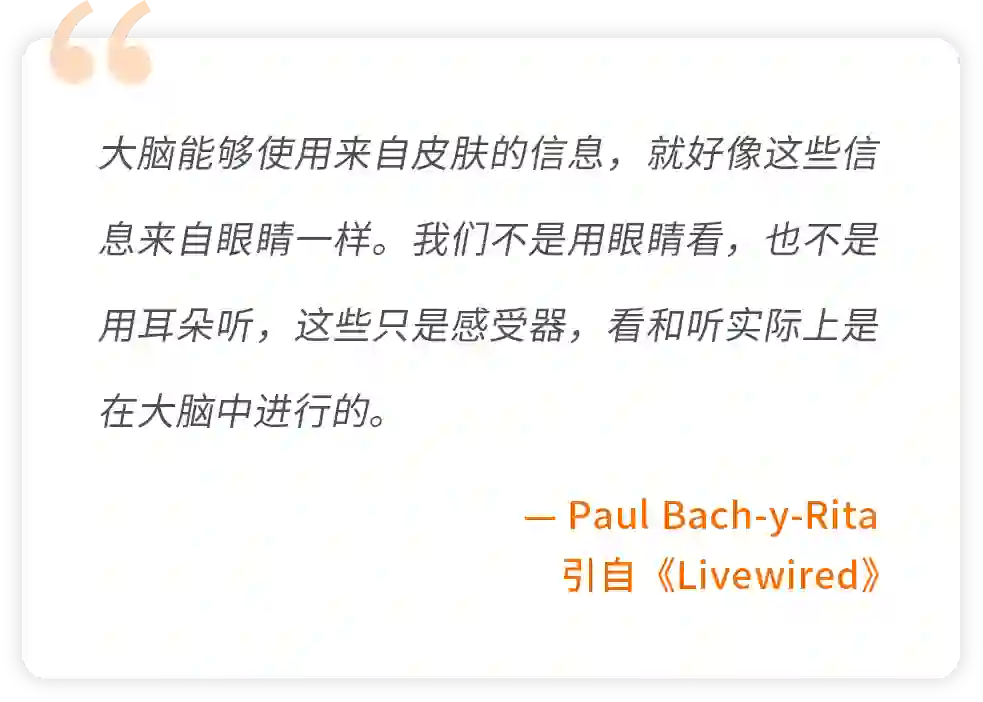 人类有一种很神奇的能力,可以使用一种感官方式(比如触摸)来提供通常由另一种感官(比如视觉)收集的环境信息。这种适应性能力,被称为感官替代 (Sensory substitution),是神经科学领域一个很有名的现象。一些有难度的适应,例如适应上下颠倒着看东西、学习骑乘“反转”自行车,或学习通过解读放置在舌头上的电极网格发射的视觉信息来“看”,可能需要几周、几个月甚至几年的时间才能掌握,但无论多难,人们最终都能够适应感官替代。